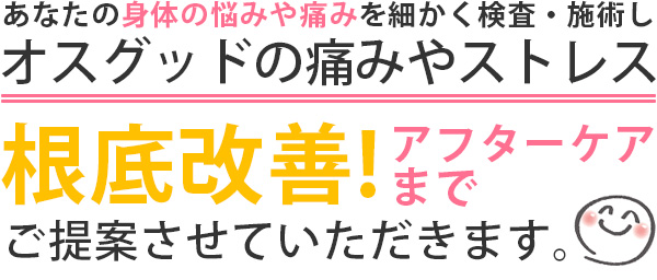 当院は主に筋肉が原因で来る痛みや障害に特化している整体院となっていて、痛みがなくなった後のメンテナンスはもちろん、運動選手の怪我予防から、パフォーマンスUPまでお手伝いさせていただき、生涯現役を合言葉に地域の方のお役に立てるよう常に最新の施術ができるよう努力をしています。